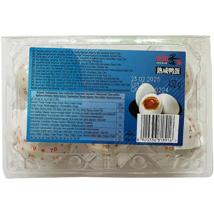 GOOSUN Gekochte & Gesalzene Enteneier (432 g) sind eine traditionelle chinesische Delikatesse – bereits verzehrfertig, würzig im Geschmack und mit hohem Proteingehalt. Die Eier sind gekocht, mit Salz haltbar gemacht und eignen sich hervorragend als Beilage zu Reisgerichten, asiatischen Frühstücken wie Congee oder als proteinreiche Ergänzung zu Salaten. Dank ihrer natürlichen Zutaten und des salzig-eiigen Aromas sind sie ein echter Genuss für Liebhaber authentischer asiatischer Küche.