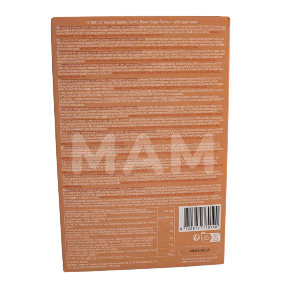 Das TOKIMEKI Bubble Tea Kit Brown Sugar (255g) bringt den beliebten asiatischen Trend direkt zu dir nach Hause! Genieße den intensiven, süßen Geschmack von braunem Zucker in einem cremigen Milchtee mit originalen Tapiokaperlen. Ideal für alle Bubble-Tea-Liebhaber, die Wert auf authentischen Geschmack und einfache Zubereitung legen.